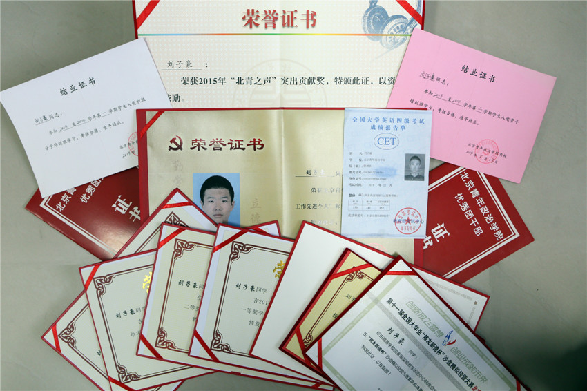 刘子豪的学习成果是耀眼的,他是学院一等奖学金的获得者,顺利通过英语四级和计算机一级考试,在全国大学生沙盘模拟经营大赛中与团队成员一同斩获北京市一等奖。俗话说:欲戴王冠,必承其重!以上种种奖励固然是对他刻苦学习最好的嘉奖,但每一张奖状的背后都蕴含着一份默默辛勤的付出,无言而有力。子豪是图书馆的常客,他会在图书馆学习功课、查阅资料。他认为读书可以增长见闻、锻炼思维、明辨是非,也可以找到自己内心的平静。所以,即便无事可做,他也不愿将时间浪费在游戏上,而是去阅览室阅读自己喜爱的书籍。所谓“天道无亲,常与善人”,他的辛勤付出担得起这些荣誉和嘉奖。