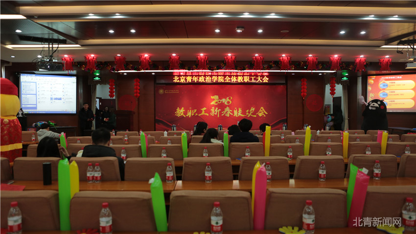 金鸡报晓去,瑞犬迎春来。1月19日下午,学院举办2018年教职工新春联欢会,喜迎戊戌狗年的到来。学院领导程晓君、乔东亮、祝文燕、高世英、易帅东、吕一中、周永源、叶向红出席联欢会,并集体为大家表演了幽默风趣的《三句半》,带来笑声一片。全体教职员工和部分学生代表参加了联欢会。